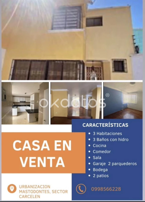 Casa carcelen URBANIZACION MASTODONTES 166 METROS DE CONSTRUCCION, SECTOR CARCELEN. DIRECCION JAIME ROLDOS AGUILERA E8-53 EN LA PRINCIPAL, SALA, COMEDOR, COCINA, DISPONE DE 3 BAÑOS, 3 DORMITORIOS, CUARTO MASTER CON BAÑO Y UNA TINA CON HIDROMASAJE, bodega, dos patios, con parqueadero