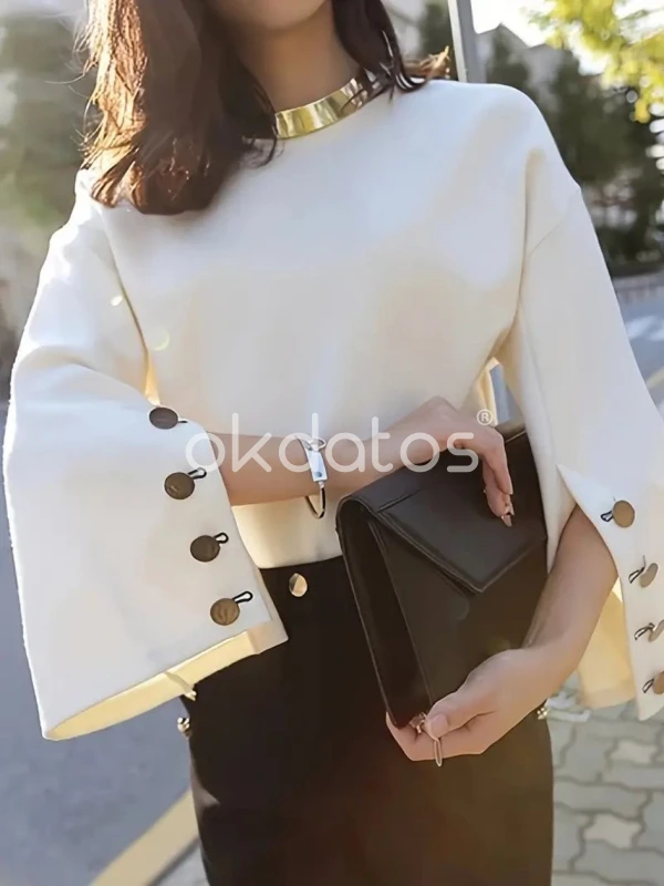 Blusa blanca de manga recta con abertura lateral botones dorados, modernos y sofisticados. Talla S - M Inf. 0963311708