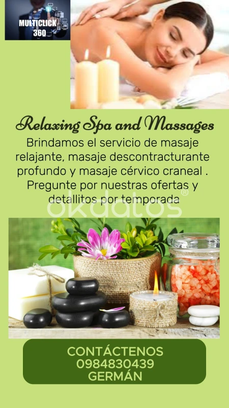 "Masajes relajantes y terapéuticos en Quito. Masaje Descontracturante Profundo, Masaje Cérvico-Craneal, Masaje con Pindas ayurvédicas, Masaje con piedras volcánicas...Sesiones personalizadas para aliviar estrés y tensión muscular. Ambiente tranquilo y profesional. Agenda tu cita por WhatsApp 0984830439."