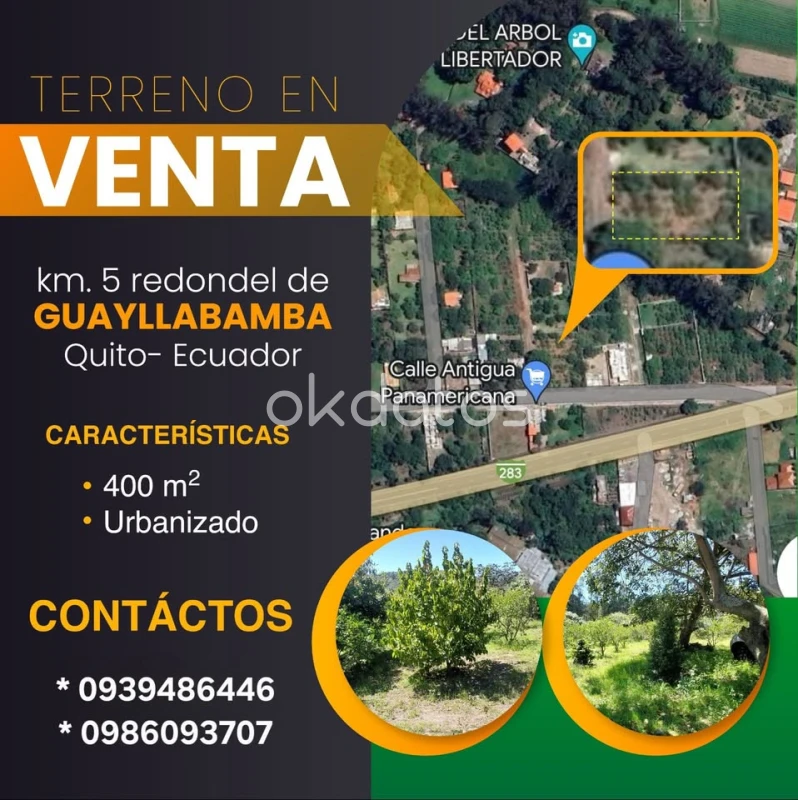 Se vende terreno de 400 m² ubicado en el sector de Guayllabamba. Dispone de agua de riego, agua potable y luz eléctrica. Topografía plana, excelente clima y ubicación, fácil acceso vehicular y peatonal. Ideal para vivienda de descanso o inversión. Documentación al día. 📞 0986093707 Contáctenos para coordinar visita y recibir plano de ubicación.