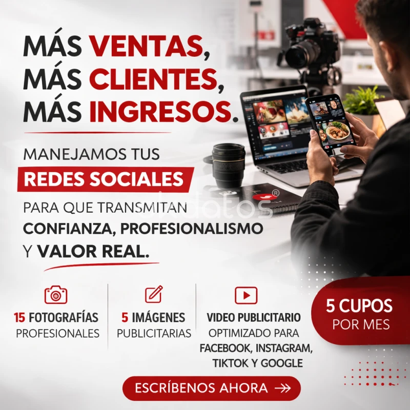 "Somos una Consultora en marketing digital en Ambato enfocados en ayudar a empresas, emprendedores y negocios locales a crecer en internet. Creamos estrategias de publicidad en Facebook e Instagram, manejo profesional de redes sociales y campañas ADS orientadas a atraer clientes reales y aumentar las ventas. Nuestro objetivo es posicionar tu negocio en el mundo digital mediante contenido estratégico, segmentación de anuncios y optimización constante de campañas publicitarias. Con nuestras estrategias de marketing digital en Ambato, tu empresa podrá tener mayor visibilidad, más interacción con clientes potenciales y mejores resultados en redes sociales. Trabajamos con negocios que desean destacar frente a su competencia y aprovechar el poder de la publicidad digital para crecer de forma constante."