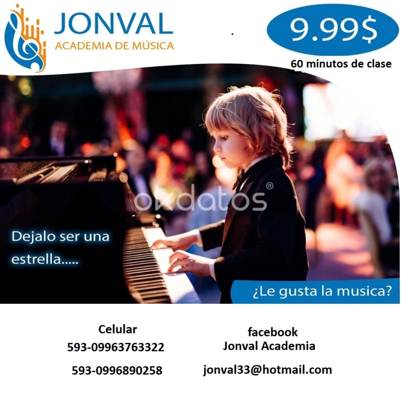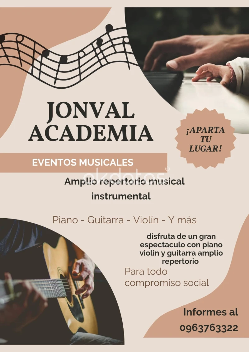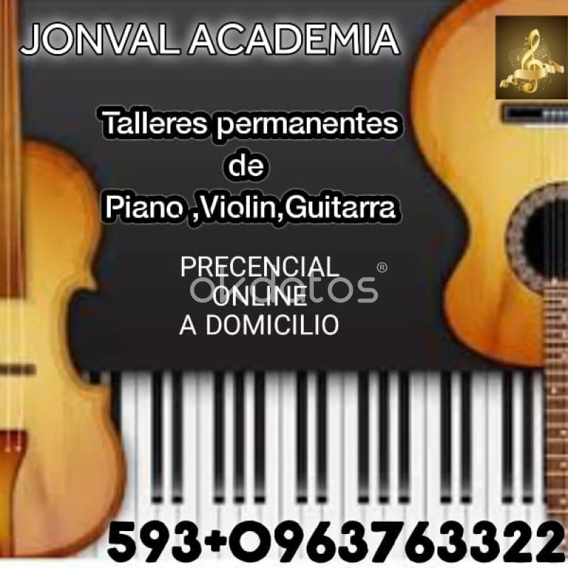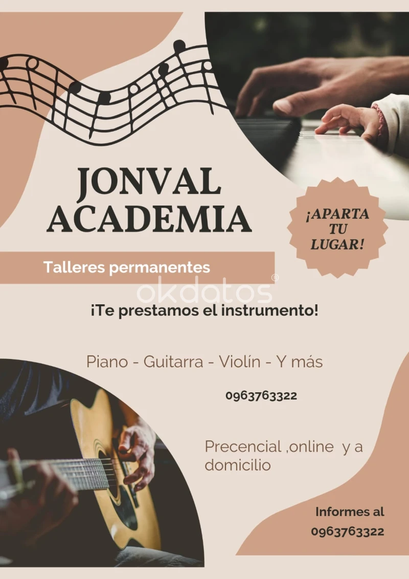 ¡Inscríbete en Jonval Academia de Música! Talleres Permanentes de Piano, Violín y Guitarra Descubre el talento musical de tus hijos con nuestros talleres presenciales, en línea y a domicilio. Metodología Utilizamos el método ORG con colores y partituras musicales, adaptándonos a las necesidades y niveles de cada estudiante. Niveles de Enseñanza Básico Intermedio Avanzado Horarios de Atención Ofrecemos horarios flexibles que se adaptan a la disponibilidad del estudiante. Ubicación Nuestra academia se encuentra en la Casa Barrial Cofavi, un lugar estratégico con múltiples rutas de acceso. Costos y Descuentos El costo por hora es de $10, pero te lo dejamos a $8 con la inscripción. Además, ofrecemos descuentos especiales para grupos familiares y clases múltiples. Modalidades de Pago Aceptamos pagos en efectivo, mediante transferencia bancaria al Banco Pichincha por adelantado, o a través de PayPal. Contáctanos Para más información, contáctanos al 0963763322. ¡No pierdas la oportunidad de desarrollar la música en la vida de tus niños!