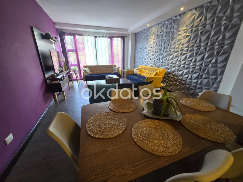 ELEGANTE APARTAMENTO EN RENTA EN ZONA 15 VHII Exclusivo edificio de apartamento estilo boutique con 6 niveles, 20 apartamentos y 3 sótanos para parqueos, elevador y terraza con áreas para eventos sociales y churrasqueras. Apartamento amplio de 125 mts2 con finos acabados, piso cerámico imitacion madera, iluminacion ojos de buey, completamente amueblado y equipado. Recibidor. Cocina de concepto abierto con top de marmol, linea blanca y desayunador. Sala y comedor con balcón. área para lavanderia. Baño para visitas. Habitación principal con balcón, baño privado y closet. con 2 camas Habitación secundaria con closet. Parqueo para 2 vehículos. Precio de renta $1,800.00 incluye mantenimiento +IVA INFORMACION AL 5410-7700 con Mercy Guillèn