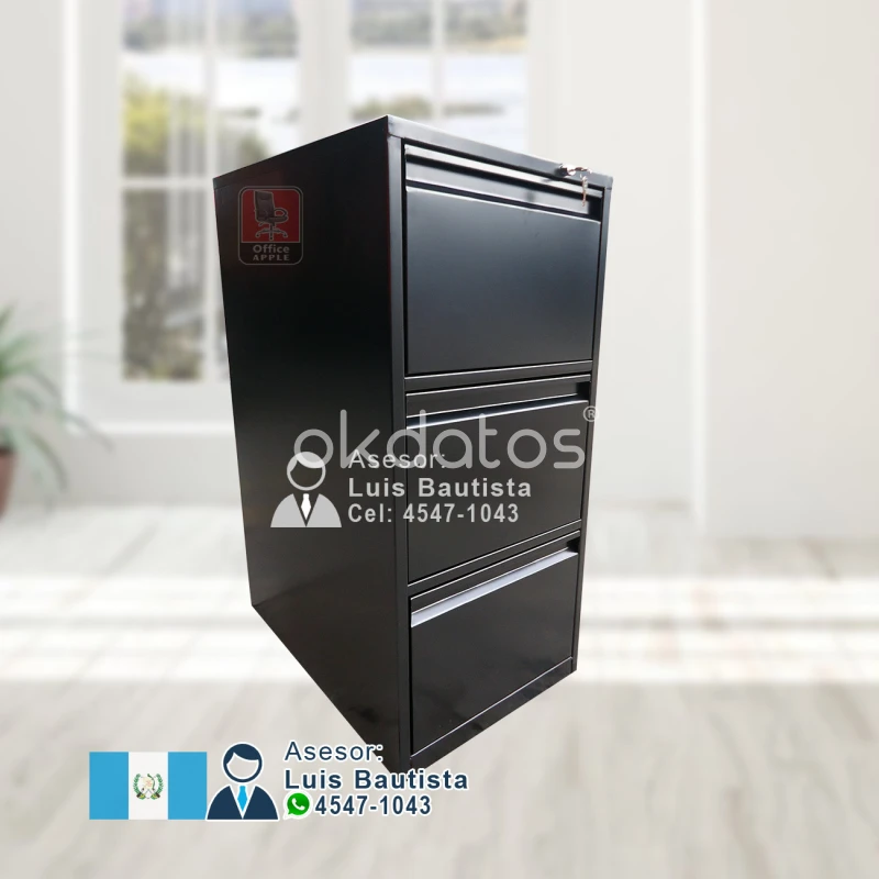 A la orden con archivos de 3 gavetas, fabricados con lamina de 0.60, finos acabados con pintura horneada, con chapa general con 2 llaves, jaladores incorporados y marcos de metal para folders colgantes de tamaño oficio. miden 102 cms, de alto, 47 cms. de ancho por 64 cms. de fondo.