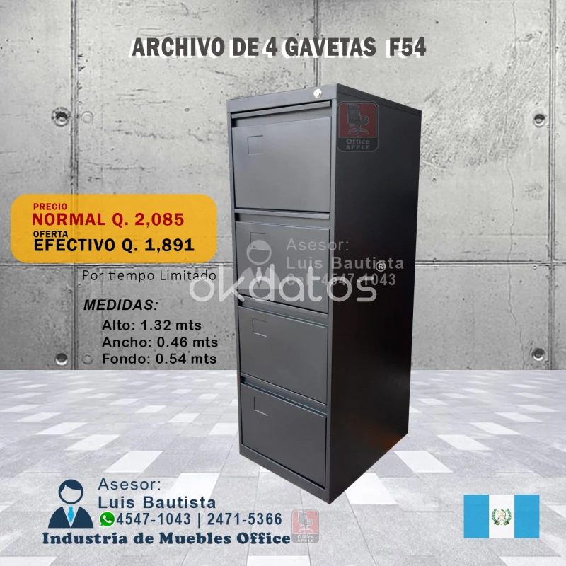 Ponemos a su disposición archivos EURO de 4 gavetas, fabricados con lámina de 0.60, pintura al horno, cuentan con chapa general con dos llaves, jaladores incorporados, así como espacios para identificación y los marcos de metal para folders colgantes tamaño oficio, excelente solución para organizar sus documentos. Mide 132 cms. de alto, 47 cms. de ancho y 54 cms. de fondo. Pídelo al contacto 4547 1043