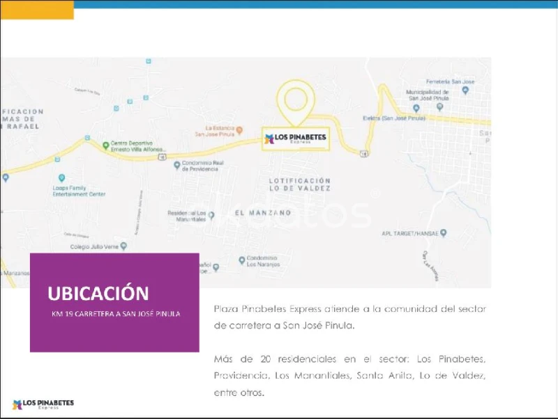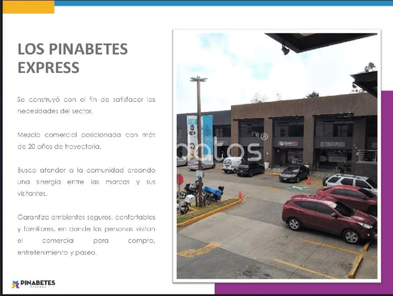 ¡Local Comercial en Renta – Plaza Pinabetes Express, Km 19 Carretera a San José Pinula! ¿Buscas un espacio estratégico para tu negocio en una plaza comercial consolidada y con alto flujo de clientes? Este local de 50 m² en segundo nivel de Plaza Pinabetes Express está disponible para alquiler inmediato. Características del Local: - Área: 50 m² - Renta mensual: Q5,500 - Mantenimiento: Q1,632.70 (incluye seguridad, mantenimiento de áreas comunes y extracción de basura) - IVA: Q660 - Agua y electricidad se paga aparte por consumo - Ubicación: Segundo nivel con excelente visibilidad - Incluye medio baño propio - Amplio parqueo gratuito para visitantes - Plaza con 36 locales comerciales, 2 niveles y mezcla de marcas reconocidas (Super 24, Sarita, Pollo Granjero, Banco Industrial, Megapaca, farmacias, clínicas, panaderías y más) - Seguridad privada 24/7 y fácil acceso desde principales avenidas - Contrato mínimo: 3 años - Depósito: 1 mes de renta Beneficios de la Plaza Pinabetes Express: - Ubicada en una de las zonas con mayor crecimiento residencial (más de 20 condominios cercanos), y a orilla de calle. - Plaza remodelada en 2020, con ambiente moderno, familiar y seguro. - Alta sinergia comercial con marcas ancla que atraen flujo constante de clientes. Ubicación: - Km 19 Carretera a San jose Pinula - https://maps.app.goo.gl/YXPFiLfEzjqVeFxB6 Contacto: 📲 Contáctanos hoy mismo al 5569-4341 (llamadas y WhatsApp) y agenda tu visita.