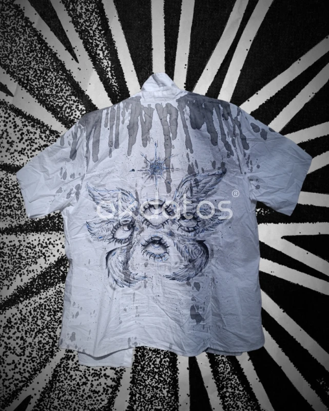 Camisa unisex intervenida a mano con diseño artístico de ojos y alas en estilo surrealista. Tela ligera, única y con detalles tipo splash que le dan un toque urbano y alternativo. Ideal para quienes buscan piezas originales y diferentes Talla XL
