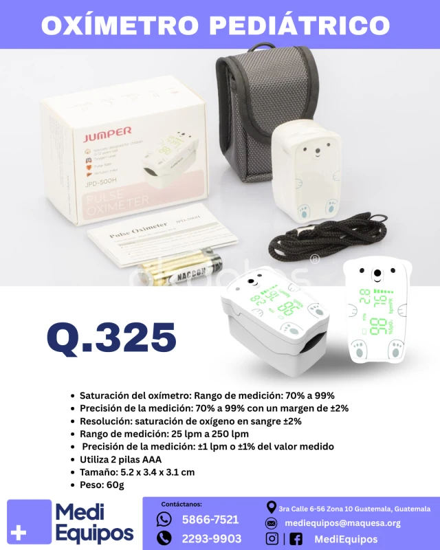 OXÍMETRO PEDIÁTRICO "¡Tranquilidad para los padres con nuestro Oxímetro Pediátrico! Monitorea la saturación de oxígeno de tus pequeños de forma fácil y divertida. Este oxímetro con diseño adorable de osito es preciso y está diseñado para adaptarse a los deditos de los niños, brindándote lecturas confiables en casa. Certificaciones y Beneficios: - Precisión: Rango de medición de 70% a 99% con un margen de ±2%. - Confiabilidad: Lectura de saturación de oxígeno y pulso. - Diseño amigable: Ideal para niños. - Fácil de usar: Utiliza 2 pilas AAA. Tips: - Asegúrate de que la mano del niño esté tibia y quieta para una lectura precisa. - Consulta a tu pediatra si tienes dudas sobre las lecturas. Super Precio: Q.325 ¡Ten uno en casa para la tranquilidad de tu familia! *Tel: 5866-7521 / 2293-9903 *Correo: mediequipos@maquesa.org *Visítanos: 3ra Calle 6-56 Zona 10 Guatemala, Guatemala *Síguenos para más productos de salud y cuidado infantil: Facebook: MediEquipos Instagram: MediEquipos TikTok: MediEquipos