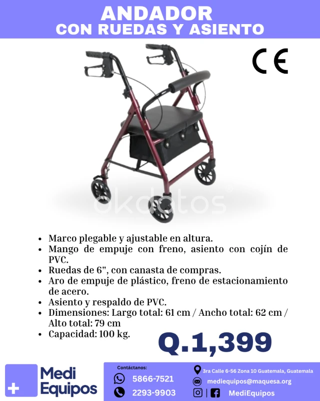 Andador con Ruedas y Asiento ¡Comodidad y apoyo en cada salida! Este Andador con Ruedas y Asiento es perfecto para descansar cuando lo necesites. Incluye frenos y canasta. Beneficios: - Plegable y ajustable en altura - Asiento con cojín de PVC - Freno de estacionamiento - Canasta de compras *¡Consíguelo a un super precio por Q.1,399! *Contáctanos: 5866-7521 / 2293-9903 *Coreo: mediequipos@maquesa.org * Visítanos: 3ra Calle 6-56 Zona 10, Guatemala