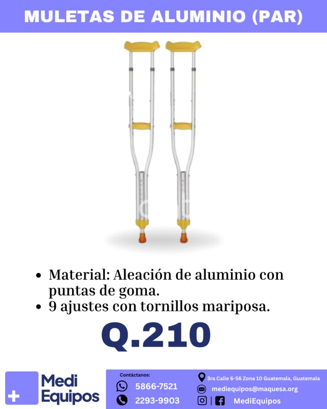 ¡RECUPÉRATE MÁS RÁPIDO! MULETAS DE ALUMINIO (PAR) * Livianas y resistentes * 9 niveles de ajuste * Puntas antideslizantes * Cómodas y seguras * Perfectas para fracturas, lesiones o post cirugía. *PRECIO ESPECIAL Q.210 *WhatsApp: 5866-7521 *Número fijo: 2293-9903 *Correo: mediequipos@maquesa.org *Visítanos: Zona 10 Guatemala
