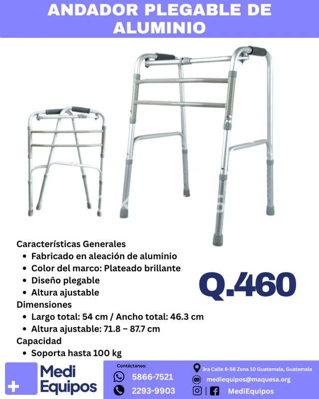 ANDADOR PLEGABLE DE ALUMINIO 👵👴 Brinda seguridad, estabilidad e independencia al caminar. * Fabricado en aleación de aluminio * Altura ajustable * Diseño plegable * Soporta hasta 100 kg * Beneficios: * Liviano y resistente * Fácil de guardar * Ayuda a prevenir caídas * Ideal para adultos mayores y rehabilitación *Super Precio: Q.460 * Tip: Ajusta la altura al nivel de la muñeca para una postura correcta. *Contáctanos: 5866-7521 / 2293-9903 *Correo: mediequipos@maquesa.org *Visítanos: Zona 10 Ciudad Guatemala *Síguenos: Facebook | Instagram | TikTok: MediEquipos
