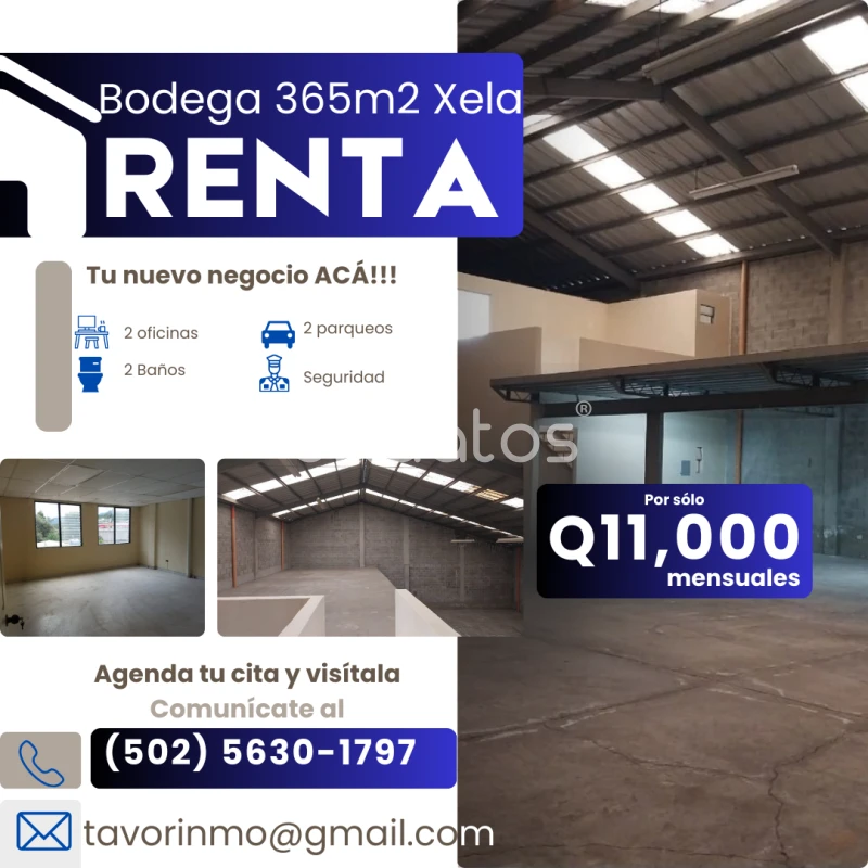 Bodega Xela QUETZALTENANGO Almacenaje nivel 1: 240.70m2 + mezzanine y oficinas 124.49m2, Area total Ofibodega 365.19m2, 2 baños, 3 parqueos. Renta Q.11,000 Incluye IVA, mantenimiento, seguridad, agua 10m3, 2 meses de depósito + seguro contra daños del producto al inmueble. WhatsApp 5630-1797 http://shre.ink/tavorinmo