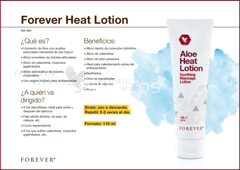 Deje que sus músculos experimenten la sensación relajante de Forever Aloe Heat Lotion después de un largo y estresante día. Potenciada por aloe, ultra rica y no grasosa, esta cremosa loción es ideal para masajear la piel cuando lo necesite. • Ayuda a calmar los músculos adoloridos • Revitaliza la piel • Aroma de mentol y eucalipto • Agradable para Vegetarianos • Agradable para Veganos • Sin Gluten Experimente la sensación relajante que brinda Forever Aloe Heat Lotion después de un arduo entrenamiento o un largo día de trabajo. Esta fórmula con el poder del aloe ofrece efectos calentadores y de enfriamiento para ayudar a aliviar los músculos adoloridos. ¡Compra con un 5% de descuento inmediato! Regístrate en Forever Living Guatemala como Cliente Preferencial para comprar directamente al fabricante y disfrutar de beneficios exclusivos. 🛒 Enlace de registro: https://guatemala.flp.com Al registrarte, recibirás tu número de Forever ID para realizar pedidos por teléfono, WhatsApp o directamente en la oficina de Ciudad de Guatemala con un 5% de descuento. ℹ️ Más información: Martina Hahn, Naturópata y FBO desde 2002. Martina reside en Italia pero gestiona clientes a nivel internacional. 📲 Móvil y WhatsApp: +39-3407012181 Los productos se envían desde la oficina de Ciudad de Guatemala directamente a tu domicilio.