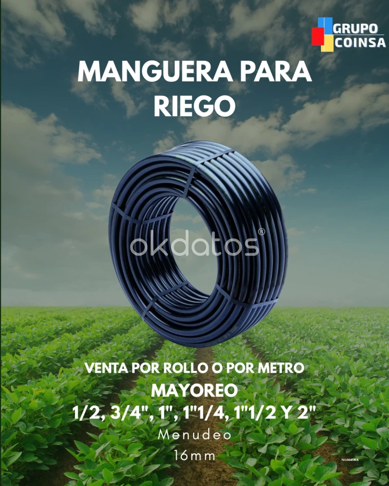 Equipa tu sistema de riego con nuestras mangueras de alta calidad, ideales para uso agrícola, jardines o sistemas profesionales de riego. Disponibles en medidas desde 1/2" hasta 2” y en presentación de mayoreo o menudeo. - Venta por rollo o por metro los precios varían dependiendo de la cantidad a comprar. - Diámetros: 1/2", 3/4", 1", 1 1/4", 1 1/2" y 2" - También contamos con medida de 16 mm para menudeo - Flexibles, resistentes al sol y al uso continuo ¡Riega de forma eficiente y sin complicaciones! Contáctanos y recibe asesoría personalizada según tu cultivo. Tel. 614 341 5815 WhatsApp. 614 189 9902 Encuentranos en Blvd. Jose Fuentes Mares 809, Villa Juarez, 31064 Chihuahua,, Chih.