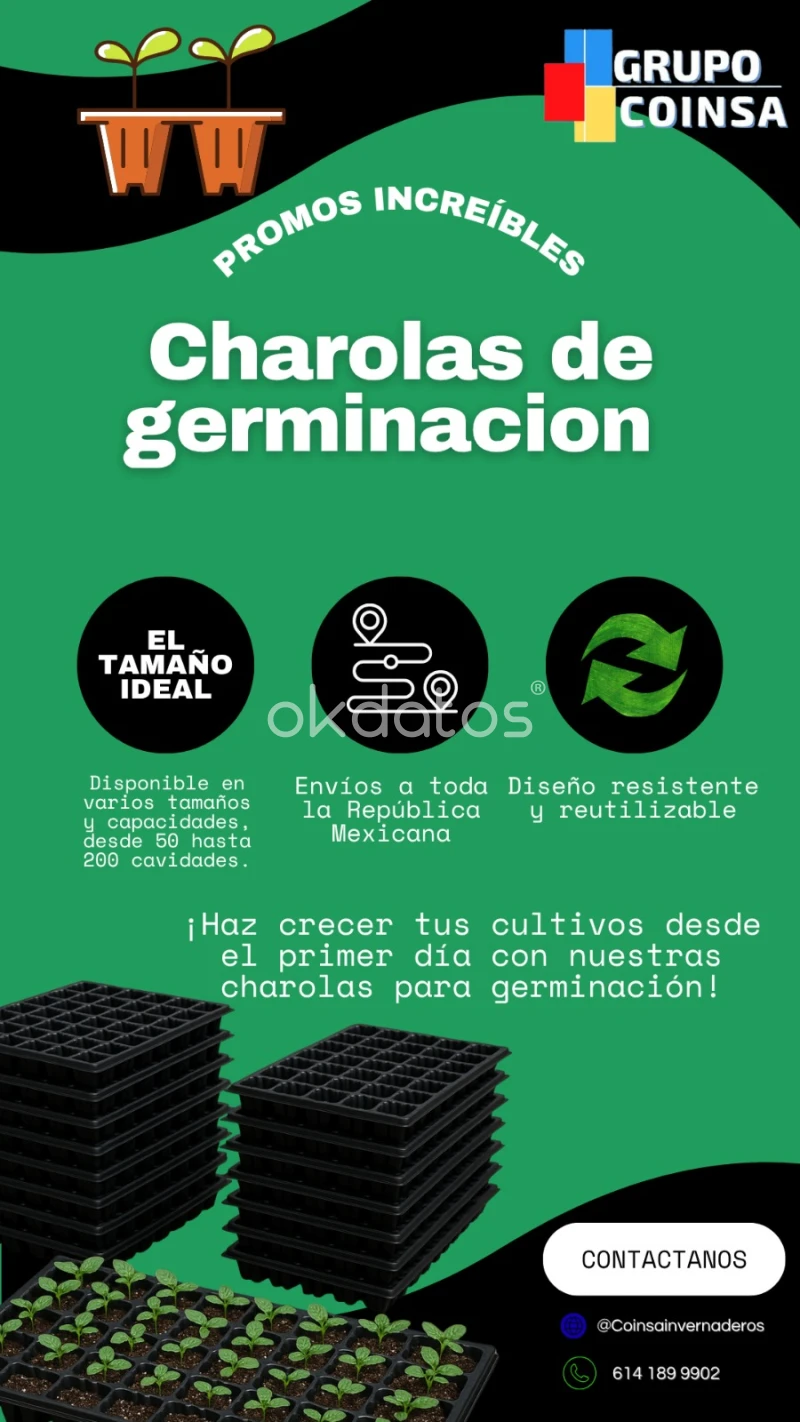 Inicia tus siembras de forma práctica y ordenada con nuestras charolas para germinado, ideales para huertos, viveros, hidroponía o producción a gran escala. - Diseño resistente y reutilizable - Cavidades individuales para un crecimiento uniforme - Facilitan el manejo, riego y trasplante - Ideales para germinar hortalizas, flores, pasto forrajero, aromáticas y más - Material plástico de alta calidad, fácil de limpiar Disponibles en varios modelos: desde 50 hasta 200 cavidades Venta por pieza o en paquete ¡Haz crecer tus semillas con orden, eficiencia y éxito! Tel. 614 341 5815 WhatsApp 614 189 9902 Encuentranos en Blvd. Jose Fuentes Mares 809, Villa Juarez 31064 Chihuahua,, Chih. Consulte precios y cotizaciones.