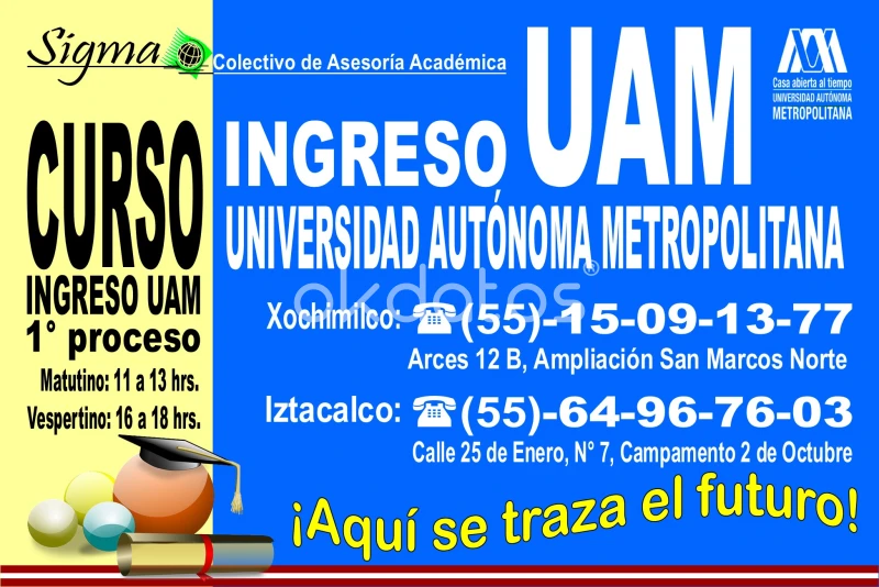 Ingreso UAM Universidad Autónoma Metropolitana 2025-2026 "La educación no cambia al mundo, cambia a las personas que van a cambiar el mundo." Colectivo de Asesoría Académica Sigma ¡Aquí se traza el futuro! En Iztacalco: 55-64-96-76-03 En Xochimilco: 55-63-06-31-57 — Ingreso al Nivel Medio Superior (prepa-voca) ECOEMS: ENP-CCH-CECyT,... — Ingreso al Nivel Superior: UNAM-IPN-UAM-ESEF,... — Certificación de NMS Exacer-ColBach,... — Regularización todos los niveles, todas las materias,...