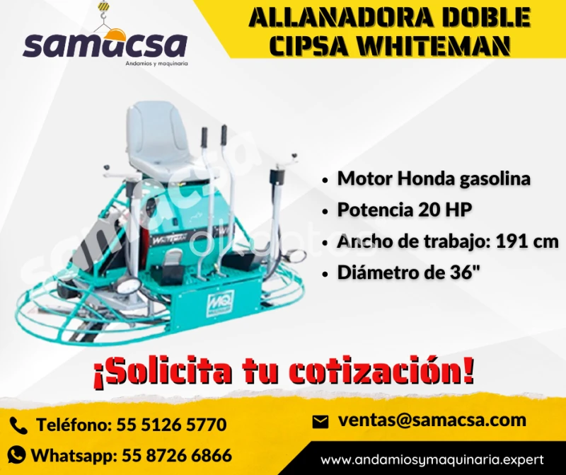 La allanadora doble de operador a bordo es la solución ideal para obtener acabados de alta planicidad en proyectos que requieren cubrir grandes superficies con rapidez, precisión y durabilidad. Disponible en configuración superpuesta o no superpuesta (ideal para uso con discos de flotación). Nuestro modelo no superpuesto es especialmente recomendado para pisos industriales de gran magnitud, garantizando un desempeño óptimo y uniforme. Características principales Versiones con accionamiento mecánico o hidráulico. Disponible con motor Honda, a gasolina o diésel. Configuraciones traslapables y no traslapables. Opciones de 36” y 48”. Transmisiones y caja de engranes para trabajo pesado. Sistema patentado de inclinación simultánea, que ofrece mayor control y precisión. Solicita tu cotización sin compromiso Envíos a toda la República Mexicana y atención inmediata. Asesor Comercial: Roberto Arellano Teléfonos: 55 5126 5770 WhatsApp: 55 8726 6866 E-mail: contacto@samacsa.com Sitios web: andamios.expert maquinariawackernewson.com albamexico.mx bandadepvc.mx andamiosymaquinaria.expert SAMACSA – Andamios y Maquinaria Ligera