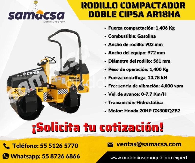 Potencia, eficiencia y calidad en cada compactación El rodillo vibratorio sencillo PR8 de CIPSA ofrece un alto nivel de desempeño, comparable al de equipos de mayor tamaño. Es la solución ideal para bacheo, caminos, almacenes, estacionamientos y trabajos en espacios reducidos. Diseñado para compactar: Bases granulares Suelos cohesivos o mixtos Pequeños estacionamientos Caminos y áreas urbanas Ventajas principales: Compactación estática y dinámica para mejores resultados Rodillo de apoyo que facilita el manejo Manubrio ajustable y aislado contra vibración Embrague mecánico de alta durabilidad Transmisión hidrostática de bajo mantenimiento Sistema rociador de agua integrado ASESOR COMERCIAL: Roberto Arellano Solicita tu cotización sin compromiso. Hacemos envíos a toda la República Mexicana y ofrecemos respuesta rápida. 📞 Teléfonos: 55 5126 5770 📱 WhatsApp: 55 8726 6866 📧 E-mail: contacto@samacsa.com Sitios web: https://www.andamios.expert https://maquinariawackerneuson.com https://www.albamexico.mx https://www.bandadepvc.mx https://www.andamiosymaquinaria.expert