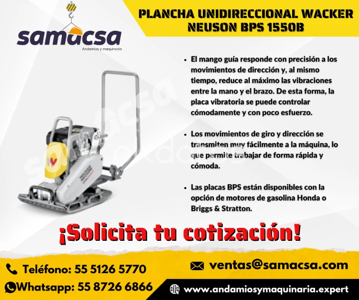 Modelo BPS 1550 B – Unidireccional La serie BPS de Wacker Neuson destaca por su excelente maniobrabilidad y comodidad de uso. Su desempeño sobre asfalto fresco es inigualable, permitiendo un manejo suave y preciso para lograr acabados limpios y sin marcas. Gracias a los bordes laterales angulares de la placa base, es posible trabajar con gran precisión incluso en bordillos y zonas de difícil acceso. El mango de guía ergonómico responde con total precisión a los movimientos de dirección y reduce significativamente las vibraciones mano-brazo a menos de 5 m/s², lo que permite jornadas de trabajo más largas, seguras y cómodas, con mínimo esfuerzo para el operador. ✅ Ventajas principales: Excelente control y maniobrabilidad Acabados profesionales sin marcas Ideal para asfalto fresco y bordillos Vibración reducida para mayor confort Operación cómoda y eficiente 📞 ASESOR COMERCIAL Roberto Arellano 🌐 Sitios web: https://www.andamios.expert/ https://www.albamexico.mx/ https://www.bandadepvc.mx/ https://www.andamiosymaquinaria.expert 📦 Envíos a toda la República Mexicana 📝 Solicita tu cotización sin compromiso 📱 Tel: 55 5126 5770 📲 WhatsApp: 55 8726 6866 📧 E-mail: contacto@samacsa.com SAMACSA – Andamios y Maquinaria Ligera