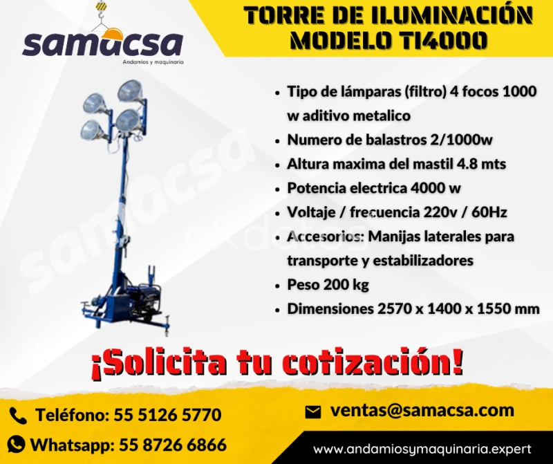 Las Torres de Iluminación MPOWER TI8.8 están diseñadas para ofrecer iluminación de alta intensidad en entornos exigentes y zonas remotas. Son ideales para obras de construcción, trabajos nocturnos, eventos, emergencias y proyectos industriales, garantizando alto desempeño, confiabilidad y largas jornadas de operación. Gracias a su diseño robusto y fácil transporte, estas torres de luz ofrecen un rendimiento óptimo en cualquier situación. ⚙️ Especificaciones técnicas: Generador MPOWER de 6,500 W 4 lámparas de 1,000 W cada una Altura máxima: 4.8 m Peso: 200 kg Voltaje: 220 V Winch: 2.0 Método de arrastre: 2 llantas Gatos estabilizadores: 3 Arranque: Eléctrico 📍 Disponibles en venta y renta en CDMX 🚚 Envíos a toda la República Mexicana 📞 Solicita tu cotización sin compromiso Asesor comercial: Roberto Arellano 📱 Teléfono: 55 5126 5770 📲 WhatsApp: 55 8726 6866 📧 Correo: contacto@samacsa.com 🌐 Sitios web: https://www.andamios.expert https://www.albamexico.mx https://www.bandadepvc.mx https://www.andamiosymaquinaria.expert SAMACSA – Andamios y Maquinaria Ligera