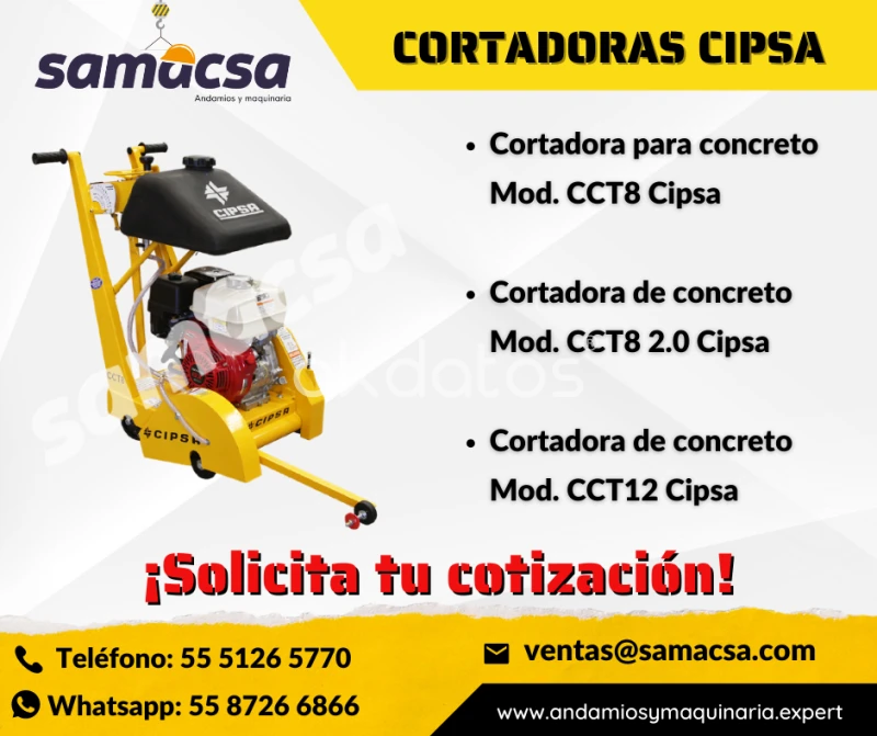 Potencia, precisión y durabilidad para concreto y asfalto La CIPSA CCT12 es una cortadora de piso ligera y robusta, ideal para cortes en concreto, juntas de expansión y trabajos de mantenimiento, así como para asfalto. Diseñada para ofrecer alto rendimiento en obra y fácil maniobrabilidad. ✅ Características principales Cortadora de piso para concreto y asfalto Marca CIPSA, modelo CCT12 Compatible con discos de 12” a 18” Disponible con accionamiento mecánico o hidráulico Tanque de agua de 20 litros Peso: 85 kg Opciones de motor Honda: 8.0 y 9.0 HP Mpower: 9.0 HP Kohler: 9.5 HP Disponibles en versiones Gasolina y Diesel ⭐ Ventajas Equipos confiables y de alto desempeño Variedad de motores para adaptarse a tu proyecto Ideal para obra civil, mantenimiento y pavimentación ASESOR COMERCIAL: Roberto Arellano Sitios web: https://www.andamios.expert/ https://www.albamexico.mx/ https://www.bandadepvc.mx/ https://www.andamiosymaquinaria.expert Envíos a toda la República Mexicana Solicita tu cotización sin compromiso