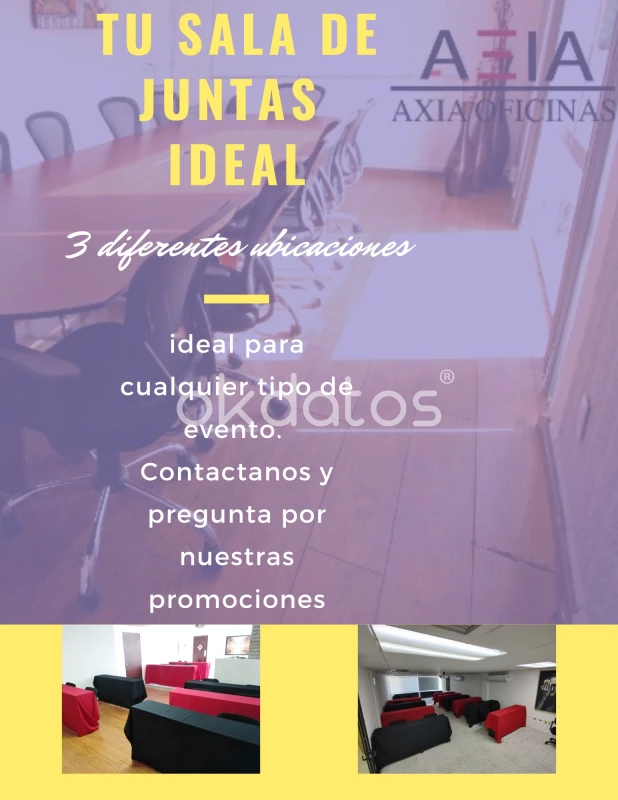 No te estreses de donde realizar tu evento, tenemos capacidad para 10, 20 o 35 personas, solo debes elegir la fecha que necesites. Contamos con proyector pantalla pintarròn y estaciòn de cafè. Ven a conocernos estamos ubicados en 3 puntos estratègicos al norte de la ciudad, en Axia Oficinas encontraràs comodidad, presencia y ahorro, pregunta por la promoción del mes. Llàmanos estaremos a tus ordenes en 4777520843 manda whats y te atendemos de inmediato