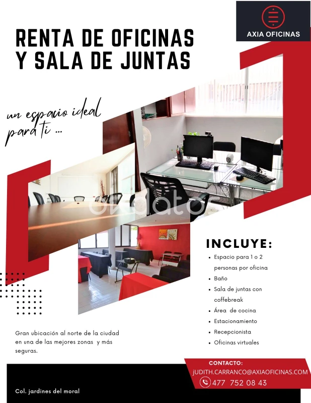 Si andas en busca de un espacio confortable para tus necesidades, ven a conocernos, estamos en el corazón de Jardines del Moral. Pregunta por la promo del mes en la renta de tu sala de juntas!!. Cuenta con Proyector Pantalla Pintarrón Estación de café Ubicados en el corazón de jardines del moral (477) 7520843 llámanos o manda mensaje, es te estamos esperando!!