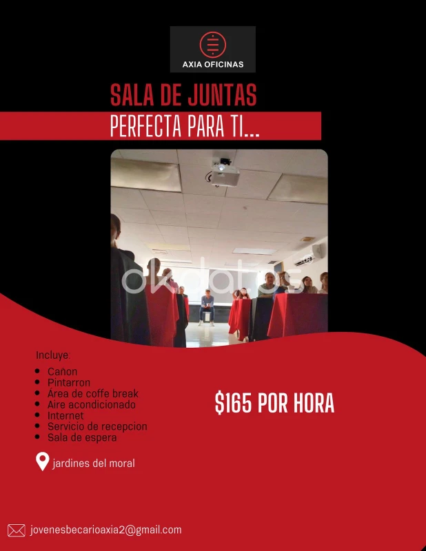 ¿Cansado de los ambientes aburridos y reducidos? En Axia Oficinas tenemos la solución para ¡ustedes! Ofrecemos: Espacio amplio y fresco. -Aire acondicionado -Ventilación natural -Ventilación eléctrica Ambiente. -Ejecutivo -Empresarial Servicios. -Eléctrico -Agua -Internet -Telefonía ¡No lo pienses más! Contáctanos 477 752 08 43