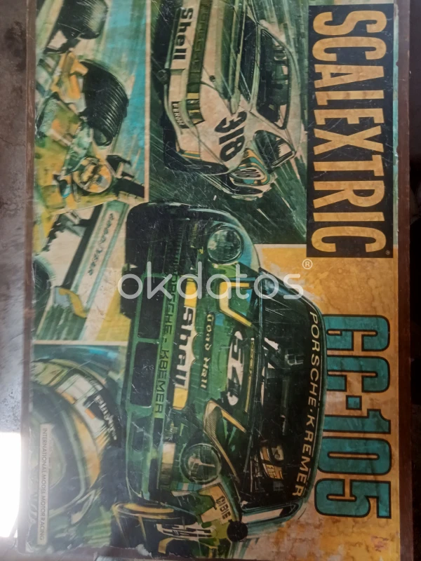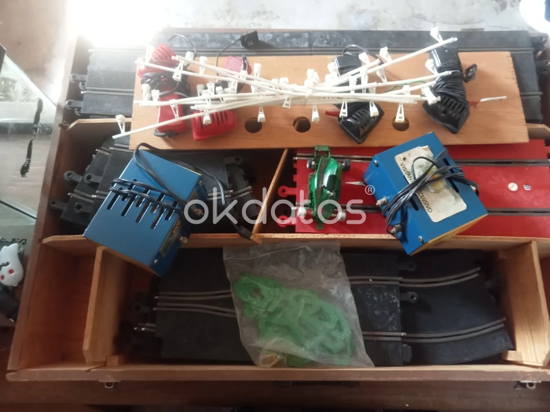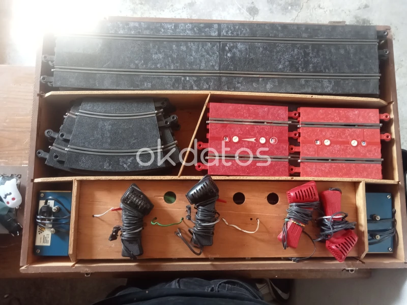 Pista Scalextric original modelo GC-105, versión clásica/vintage. Incluye caja de madera original, pistas completas (rectas, curvas y extensiones), transformadores originales y manuales originales.