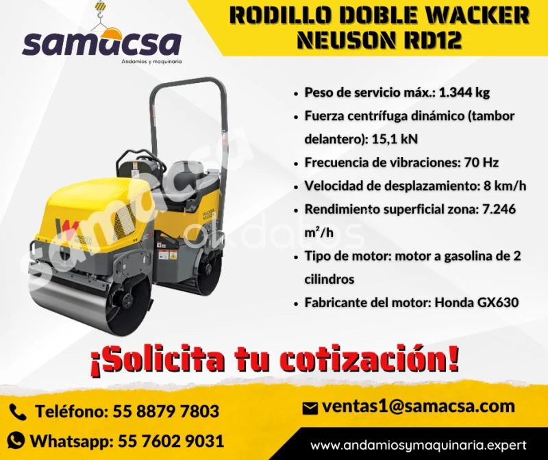 RODILLO VIBRATORIO DOBLE WACKER NEUSON RD12 Compactación precisa con alta velocidad y cobertura uniforme El Wacker Neuson RD12 es un rodillo tándem compacto ideal para trabajos de asfaltado y compactación en espacios reducidos. Gracias a su doble accionamiento de tambor, ofrece una compactación uniforme y eficiente, asegurando acabados de calidad profesional incluso en terrenos exigentes. 🛠️ Características principales: • Ancho de tambor: 900 mm • Peso operativo: 1.2 toneladas • Rodillos vibratorios dobles para máxima eficiencia • Alta frecuencia del excitador, ideal para trabajar a mayor velocidad • Accionamiento en ambos tambores, que mejora el acabado y la maniobrabilidad • Ideal para bacheo, reparación de caminos, estacionamientos y superficies urbanas ✅ Ventajas competitivas: ✔️ Compactación rápida y pareja ✔️ Rendimiento profesional en espacios reducidos ✔️ Maniobrabilidad excelente ✔️ Eficiencia en consumo de combustible ✔️ Ideal para obras viales y urbanas 📲 Solicita tu cotización sin compromiso 🚚 Envíos a toda la República Mexicana 💬 Respuesta inmediata en WhatsApp: Click aquí 📧 Correo: ventas1@samacsa.com 📞 Teléfono: 55 8879 7803 👩💼 Asesor Comercial: Karen García 🌐 Visítanos en: www.andamios.expert www.bandadepvc.mx www.andamiosymaquinaria.expert www.samacsa.com