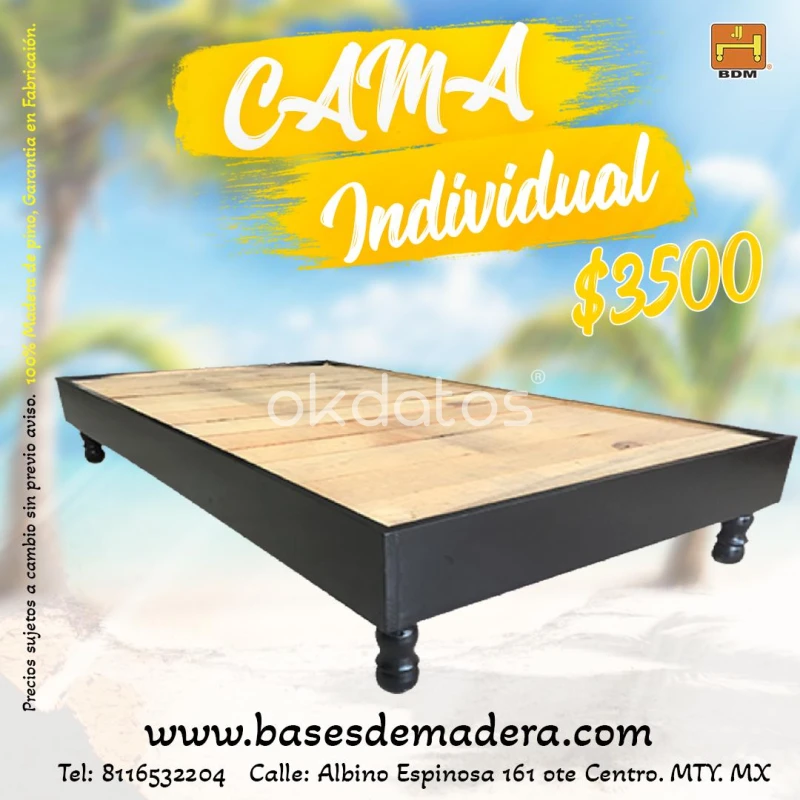 ¿Vives en MTY? ¡Tengo tu próxima cama! Base individual de pino, súper resistente y con un diseño impecable. Visítanos de Martes - Viernes 10:30am-6:00pmy Sábados 10:30am-5:00pm Ubicación : A. Espinosa#161 Ote, Centro, Monterrey. O mándame WhatsApp o llámanos al 8116532204 Solo $3,500. ¡Calidad garantizada!