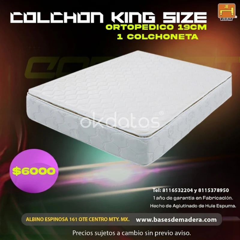 El colchón King Size ortopédico de 19 cm está diseñado para darte el soporte que tu cuerpo necesita y el confort que tu descanso merece. Su material de hule espuma de alta resistencia se adapta a tu cuerpo, ayudando a reducir puntos de presión y mejorar tu postura al dormir. Llama o manda mensaje al 8116532204 O visítanos en Albino Espinosa 161 ote Centro, Monterrey, Nuevo León, Mx. C. P. 64000 Los días de Martes a Viernes de 10:30 am - 6:00pm y los Sábados de 10:30 am - 5:00pm Consigue la tuya!! Envíos a Domicilio (Costo Extra) #ColchonOrtopedico #colchonKingSize#ColchonEconomico#ColchonResistente