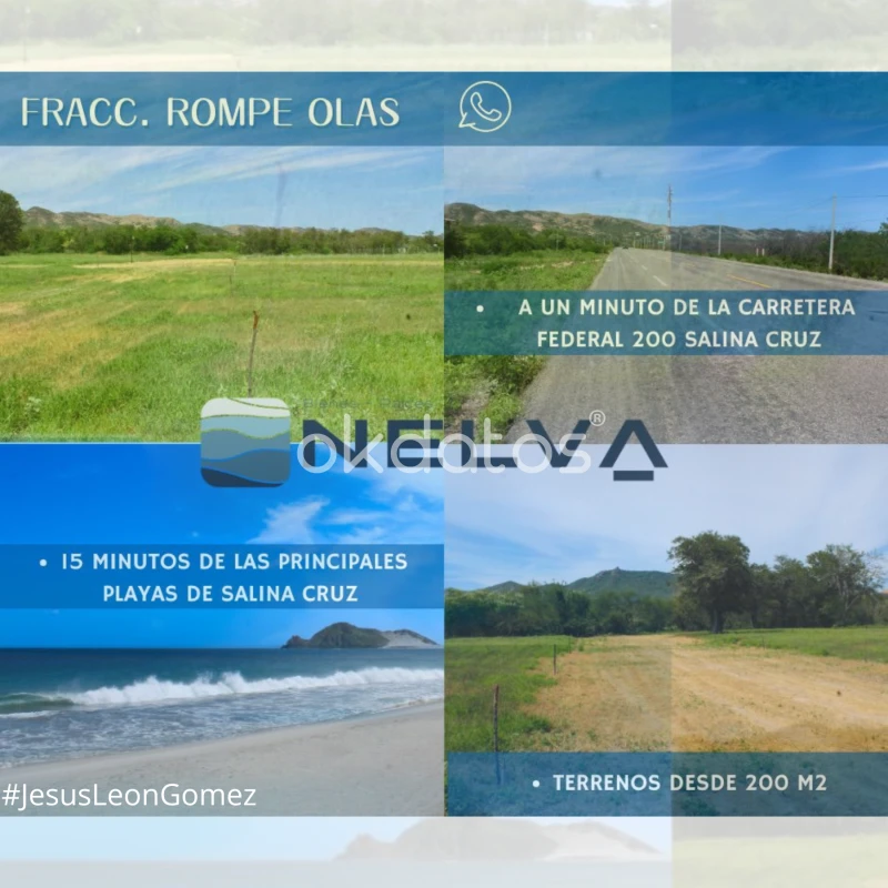 Rompe Olas es un desarrollo ubicado en una zona estratégica del Istmo, un lugar para construir con visión y tranquilidad, donde la tranquilidad del paisaje se combina con accesos rápidos hacia Salina Cruz, playas reconocidas y la ruta del Tren Interoceánico. Su entorno ofrece amplitud, claridad y una base sólida para construir un proyecto con estabilidad a largo plazo. UBICACIÓN: A 1 minuto de la Carretera Federal 200 | A 9 minutos de Salinas del Marqués y del Centro | A 10 minutos del Tren Interoceánico | A 15 minutos de Playa Conejo, Brasil y Escondida | Contemplado dentro del desarrollo del Corredor Interoceánico. CARACTERÍSTICAS: Lotes desde 200 m² | Extensiones planas listas para construcción | Energía eléctrica subterránea | Calles amplias de 10 metros | Zona costera con clima estable todo el año. AMENIDADES: Entorno natural amplio | Zona tranquila | Condiciones ideales para vivienda o inversión. PRECIOS Y PAGOS: Precios desde $145,000.00 (precio de contado) | Enganche desde el 10% o inicia con tu primera mensualidad | Plazos de 12 a 36 meses sin intereses (promoción por tiempo limitado) | Financiamiento directo sin intermediarios. SEGURIDAD: Propiedad privada con promesa de título | Proceso documental claro | Acompañamiento profesional en todo momento.