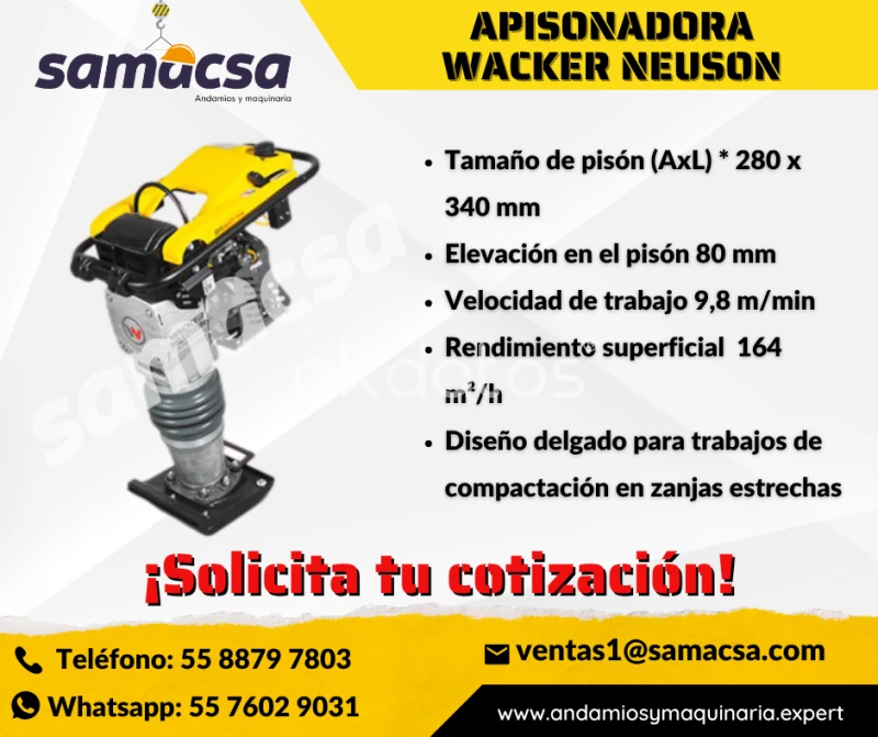 APISONADORA WACKER NEUSON – EFICIENCIA, POTENCIA Y SOSTENIBILIDAD La Wacker Neuson es una apisonadora de alto rendimiento diseñada para ofrecer resultados excepcionales en trabajos exigentes de compactación. Su diseño innovador y motor eficiente hacen que esta herramienta no solo sea poderosa, sino también amigable con el medio ambiente. 🛠️ Características destacadas: • Rendimiento superior gracias a su alto régimen de percusión y gran altura de salto • Alta velocidad de trabajo para mayor productividad • Sistema de doble tanque (combustible y aceite de 2 tiempos separados), elimina la necesidad de premezcla • Mezcla automática que asegura un funcionamiento prolongado y más limpio • Centro de gravedad bajo para una operación estable, precisa y segura ✅ Ventajas clave: ✔️ Compactación eficiente y rápida ✔️ Diseño robusto y durable para obras intensivas ✔️ Operación más limpia y sostenible ✔️ Ideal para zanjas, rellenos, bordes y áreas de difícil acceso ✔️ Excelente maniobrabilidad y balance 📲 Solicita tu cotización sin compromiso 🚚 Envíos a toda la República Mexicana 💬 Atención inmediata por WhatsApp: Click aquí 📧 Correo: ventas1@samacsa.com 📞 Teléfono: 55 8879 7803 👩💼 Asesor Comercial: Karen García 🌐 Visita nuestras páginas: www.andamios.expert www.bandadepvc.mx www.andamiosymaquinaria.expert www.samacsa.com