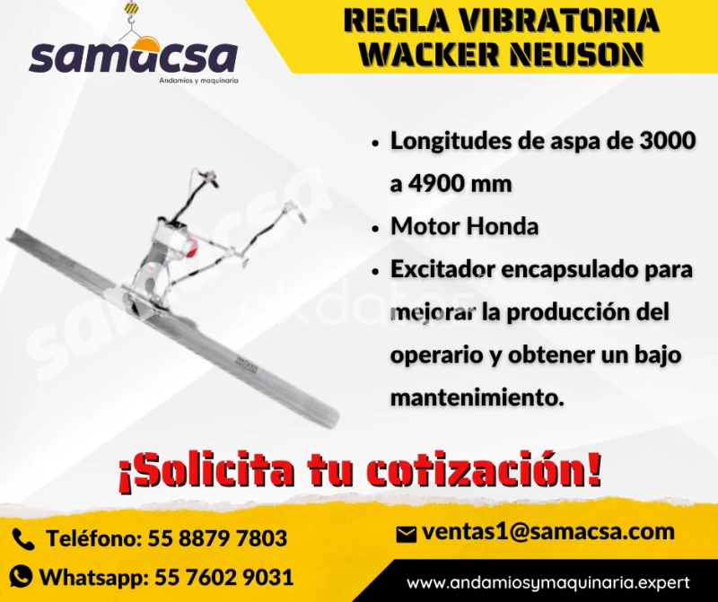REGLA VIBRATORIA WACKER NEUSON P35A – PRECISIÓN, VERSATILIDAD Y RENDIMIENTO SUPERIOR Diseñada para ofrecer resultados de alta calidad, la regla vibratoria Wacker Neuson P35A realiza tres funciones clave en el trabajo con concreto: distribuye, nivela y compacta. Su diseño ergonómico y construcción robusta la convierten en una herramienta esencial para obras de todos los tamaños. 🛠️ Características destacadas: • Realiza 3 etapas de trabajo: Distribuir – Enrasar – Compactar • Fácil de manejar y extremadamente móvil • Caja excéntrica encapsulada para mayor protección frente a suciedad, concreto y salpicaduras de agua • Manijas de transporte que facilitan su posicionamiento sobre el concreto • 7 niveles de fuerza centrífuga para adaptarse a todo tipo de mezcla ✅ Beneficios clave: ✔️ Óptimos resultados en pisos de concreto ✔️ Alta eficiencia con mínimo esfuerzo ✔️ Versátil y confiable para distintos tipos de obra ✔️ Diseño profesional para un acabado impecable ✔️ Ideal para trabajos intensivos en superficies de hormigón 📲 Solicita tu cotización sin compromiso 🚚 Envíos a toda la República Mexicana 💬 Atención inmediata por WhatsApp: Click aquí 📧 Correo: ventas1@samacsa.com 📞 Teléfono: 55 8879 7803 👩💼 Asesor Comercial: Karen García 🌐 Visita nuestras páginas: www.andamios.expert www.bandadepvc.mx www.andamiosymaquinaria.expert www.samacsa.com