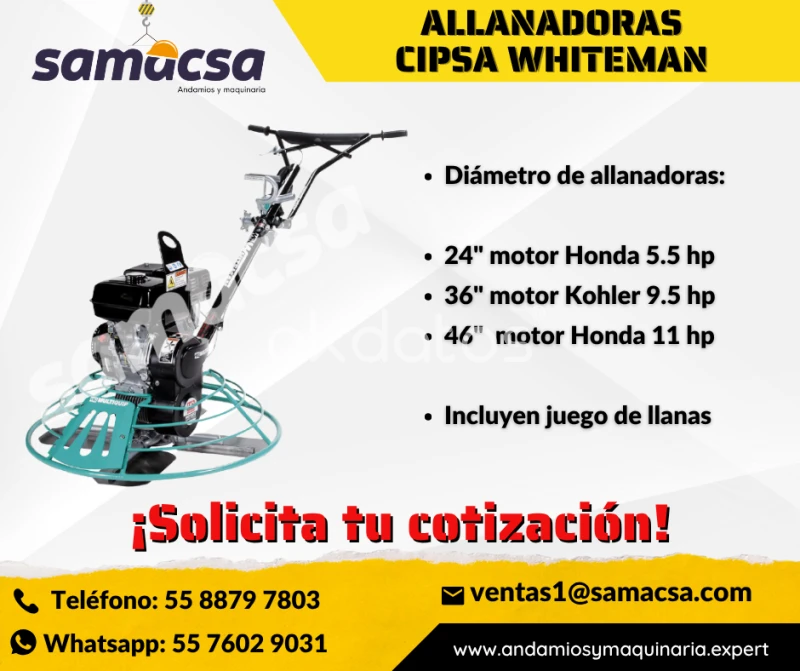 ALLANADORA CIPSA WHITEMAN – PRECISIÓN Y POTENCIA EN ACABADOS PROFESIONALES La Allanadora CIPSA Whiteman es ideal para lograr acabados finos y de alta calidad, especialmente en zonas de difícil acceso, como esquinas u orillas. Su diseño compacto y balanceado la convierte en la herramienta ideal para obras que demandan planicidad, uniformidad y eficiencia. 🛠️ Características destacadas: • Diseño compacto y maniobrable • Perfecta para obras pequeñas y medianas • Motor a gasolina o eléctrico según tus necesidades • Sistema de rótulos estabilizadores entre el aro y los brazos de aspas • Opción de manubrio Quick Pitch para ajuste rápido de inclinación • Excelente balance y facilidad de servicio ✅ Ideal para: ✔️ Construcción residencial ✔️ Pisos de concreto con acabados exigentes ✔️ Espacios reducidos y bordes de colado ✔️ Proyectos de construcción general 💡 Ventajas competitivas: 🔹 Mayor control y precisión en el acabado 🔹 Fácil de operar y mantener 🔹 Alta resistencia y durabilidad 🔹 Excelente relación calidad-precio 📲 Solicita tu cotización sin compromiso 🚚 Envíos a toda la República Mexicana 💬 Atención inmediata por WhatsApp: Click aquí 📧 Correo: ventas1@samacsa.com 📞 Teléfono: 55 8879 7803 👩💼 Asesor Comercial: Karen García 🌐 Visítanos en: www.andamios.expert www.bandadepvc.mx www.andamiosymaquinaria.expert www.samacsa.com
