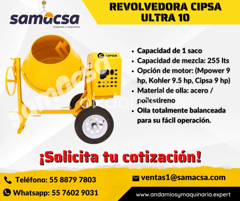 REVOLVEDORA CIPSA ULTRA 10 – ¡RENDIMIENTO, VELOCIDAD Y DURABILIDAD EN CADA MEZCLA! Haz tus mezclas más rápidas, uniformes y con menor esfuerzo con la CIPSA ULTRA 10. Diseñada para trabajar con alta capacidad y eficiencia, esta revolvedora de 1 saco está equipada con olla de acero o polietileno para una larga vida útil y fácil limpieza. Ideal para profesionales de la construcción que buscan velocidad de producción y resistencia en un solo equipo. 🔧 Especificaciones destacadas: • Capacidad de mezcla: 255 litros • Capacidad total de la olla: 350 litros • Producción por ciclo: 5 m³ • Tiempo de mezcla: Solo 3 minutos • Velocidad de olla: 28-32 rpm • Peso con motor: 235 kg • Llantas neumáticas rin 12 para fácil traslado • Dimensiones: 1,902 x 1,220 x 1,443 mm • Material de la olla: Acero o polietileno (según necesidades) 🚀 Ventajas clave: ✅ Alta capacidad y rapidez ✅ Diseño robusto y móvil ✅ Fácil de cargar y descargar ✅ Ideal para obra pesada y continua ✅ Bajo mantenimiento y larga vida útil 📦 ¡Solicita tu cotización sin compromiso! 🚚 Envíos a todo México 📲 Atención rápida en WhatsApp: Click aquí 📧 Correo: ventas1@samacsa.com 📞 Tel: 55 8879 7803 👩💼 Asesor Comercial: Karen García 🌐 Visítanos: www.andamios.expert www.bandadepvc.mx www.andamiosymaquinaria.expert www.samacsa.com