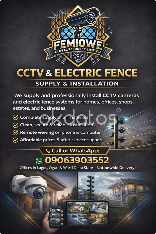 CCTV & Electric Fence Supply & Installation We supply and professionally install CCTV cameras and electric fence systems for homes, offices, shops, estates, and businesses. ✔️ Complete supply of all materials ✔️ Clean, secure & reliable installation ✔️ Remote viewing on phone & computer ✔️ Affordable prices & after-service support 📞 Call or WhatsApp: 09063903552