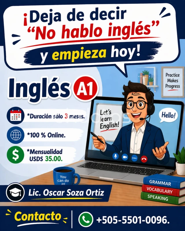 ¡Deja de decir "No hablo inglés" y empieza hoy mismo! ¿Siempre has querido aprender inglés pero no sabías por dónde empezar? Este es el momento. Nuestro curso Nivel A1 está diseñado para llevarte de la mano desde lo más básico hasta que logres tus primeras conversaciones. • Duración: Solo 3 meses. • Modalidad: 100% Online (estudia desde casa). • Intensivo: Clases de lunes a viernes para un avance real. • Inversión: Solo $35 USD mensuales. ¡Calidad a un precio imbatible! Elige el horario que mejor te convenga: • Mañanas: 7:30 - 9:00 | 9:00 - 10:30 | 10:30 - 12:00 • Tardes: 1:00 - 2:30 | 2:30 - 4:00 Lic. Oscar Soza Ortiz ¡Cupos limitados! Whatsapp: +50555010096 Correo: osoza0209@gmail.com