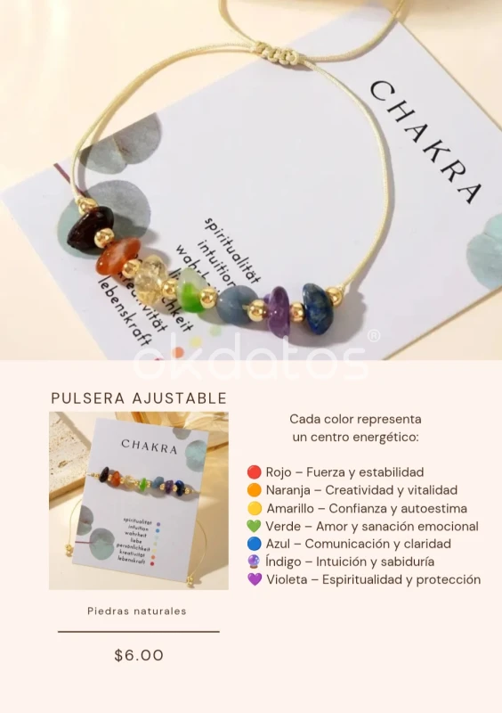Cada color representa un centro energético: 🔴 Rojo – Fuerza y estabilidad 🟠 Naranja – Creatividad y vitalidad 🟡 Amarillo – Confianza y autoestima 💚 Verde – Amor y sanación emocional 🔵 Azul – Comunicación y claridad 🔮 Índigo – Intuición y sabiduría 💜 Violeta – Espiritualidad y protección
