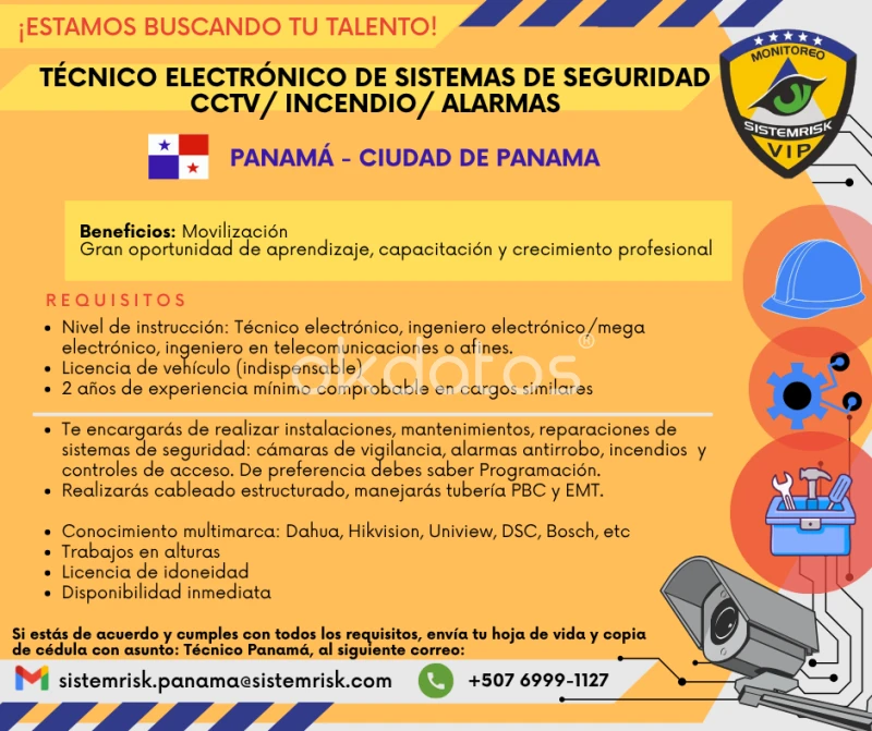 Requisitos: Nivel de instrucción: Técnico electrónico, ingeniero electrónico/mega electrónico, ingeniero en telecomunicaciones o afines. Licencia de vehículo (indispensable) 2 años de experiencia mínimo comprobable en cargos similares Te encargarás de realizar instalaciones, mantenimientos, reparaciones de sistemas de seguridad: cámaras de vigilancia, alarmas antirrobo, incendios y controles de acceso. De preferencia debes saber Programación. Realizarás cableado estructurado, manejarás tubería PBC y EMT. Conocimiento multimarca: Dahua, Hikvision, Uniview, DSC, Bosch, etc Trabajos en alturas Licencia de idoneidad Disponibilidad inmediata Beneficios: Movilización Gran oportunidad de aprendizaje, capacitación y crecimiento profesional