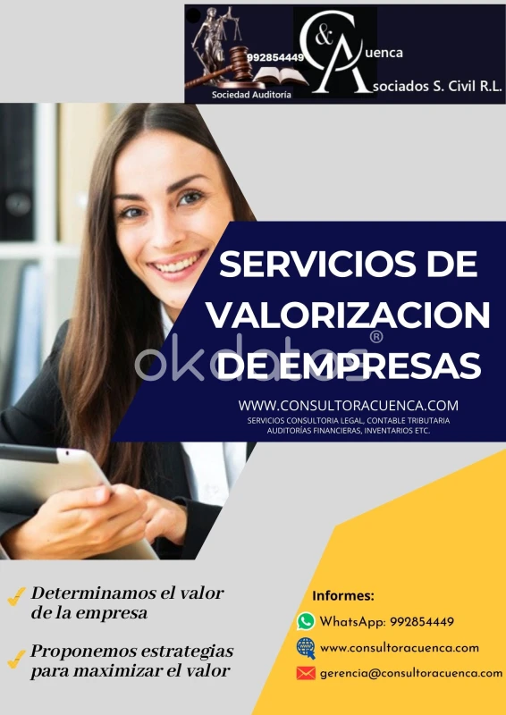 Servicios que brindamos: - Determinamos el valor de la empresa - Proponemos estrategias para maximizar el valor - Asesoría sobre nuevos decretos, leyes o modificaciones que afecten los intereses de la organización. - Asesoramiento fiscal y contable. Informes: Socio Director Richard Cuenca Chávez 992854449