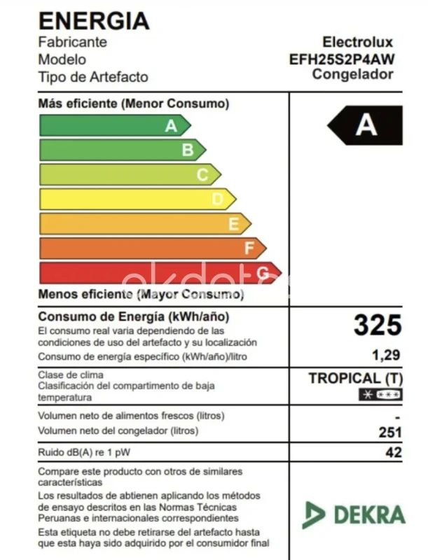 Vendo congelador horizontal Electrolux modelo EFH25S2P4AW de 251 litros, color blanco, en excelente estado y perfecto funcionamiento. Ideal para uso doméstico o negocio pequeño. Cuenta con eficiencia energética A (menor consumo), consumo anual de 325 kWh, clase climática Tropical (ideal para climas cálidos), bajo nivel de ruido (42 dB) y gran capacidad interna para almacenar carnes, pollos, pescados, helados y más. Es compacto pero espacioso, práctico y muy rendidor en consumo eléctrico. Marca reconocida y de alta durabilidad.