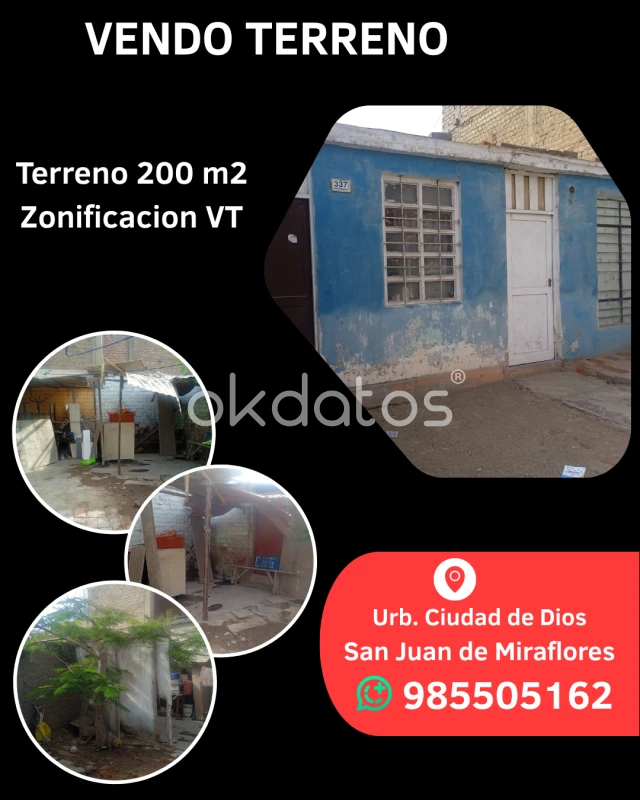 Vendo Terreno Urbano Área 200m2 Parámetro 5 pisos Zonificación VT Cuenta Agua Luz Desagüe Ubicado Urbanización Ciudad de Dios San juan de Miraflores Referencia Colegio Dolores Cavero Precio $ 220.000 A tratar Documentos en regla Informes Whatsapp 985505162