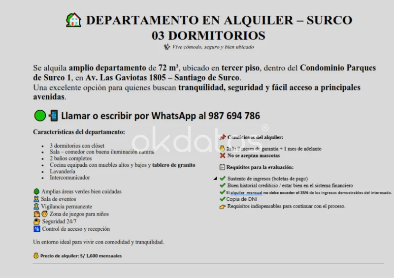 PRECIO EN SOLES. Se alquila hermoso departamento de 72 m², ubicado en 3er piso dentro del Condominio Parques de Surco 1, en Av. Las Gaviotas 1805 – Santiago de Surco. (urbanización Sagitario). 03 dormitorios ▸ Ambientes amplios y bien iluminados ▸ Condominio seguro, tranquilo y familiar ▸ Áreas comunes y vigilancia permanente ▸ Fácil acceso a avenidas principales, comercios y transporte 📩 Información y visitas Envía nombre completo y DNI 💬 WhatsApp: 987 694 786 🔗 https://wa.link/n5vocq Estacionamientos disponibles.
