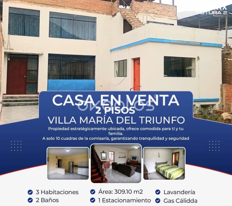 Vendo casa de 309 m² en Av. El Sol – Villa María del Triunfo. 3 pisos + sótano, 3 dorm, 2 baños, cochera, jardín. 📍 Cerca al mercado San Francisco. 💵 US$118,000 📧 info.casavillamaria@yahoo.com