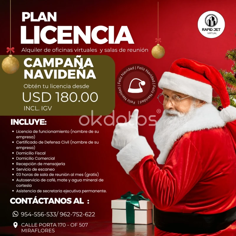¡LO MEJOR PARA TU EMPRESA, ÚNETE A NUESTRO PLAN LICENCIA! 🚀Impulsa tu negocio con el Plan Licencia de Rapid Jet 🚀 ¿Buscas una dirección comercial y fiscal sin complicaciones? Con Rapid Jet, obtén todo lo que necesitas para operar con éxito: ✅ Licencia de funcionamiento personalizada ✅ Certificado de Defensa Civil a nombre de tu empresa ✅ Domicilio Fiscal y Comercial en una ubicación privilegiada ✅ Recepción de mensajería y servicio de escaneo ✅ Salas de reuniones con 04 horas gratuitas ✅ Atención profesional con asistencia ejecutiva ✅ Café, mate y agua mineral de cortesía 🔹 Costo: USD 180.00 (Incluye IGV) 📍 Ubicación: Calle Porta 170, OF 504-507-511, Miraflores 📞 Contáctanos: 954-556-533 🕘 Horario: Lunes a viernes, 9:00 am - 7:00 pm 📢 ¡Seremos la imagen de tu empresa! 📢