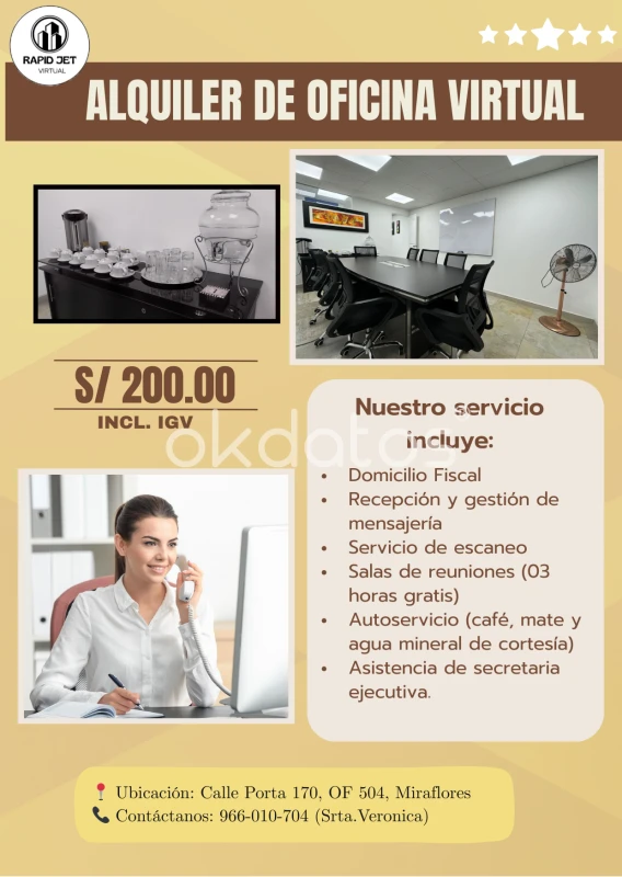 🚀 Proyecta una imagen profesional sin altos costos Con nuestra Oficina Virtual en Miraflores obtén todo lo que tu empresa necesita. Incluye: ✅ Domicilio fiscal ✅ Recepción y gestión de mensajería ✅ Servicio de escaneo ✅ 03 horas gratis de sala de reuniones ✅ Café, mate y agua mineral ✅ Secretaria ejecutiva 📍 Calle Porta 170, Miraflores 🕘 L–V | 9:00 am a 7:00 pm 📲 962 752 622 | 966 010 704