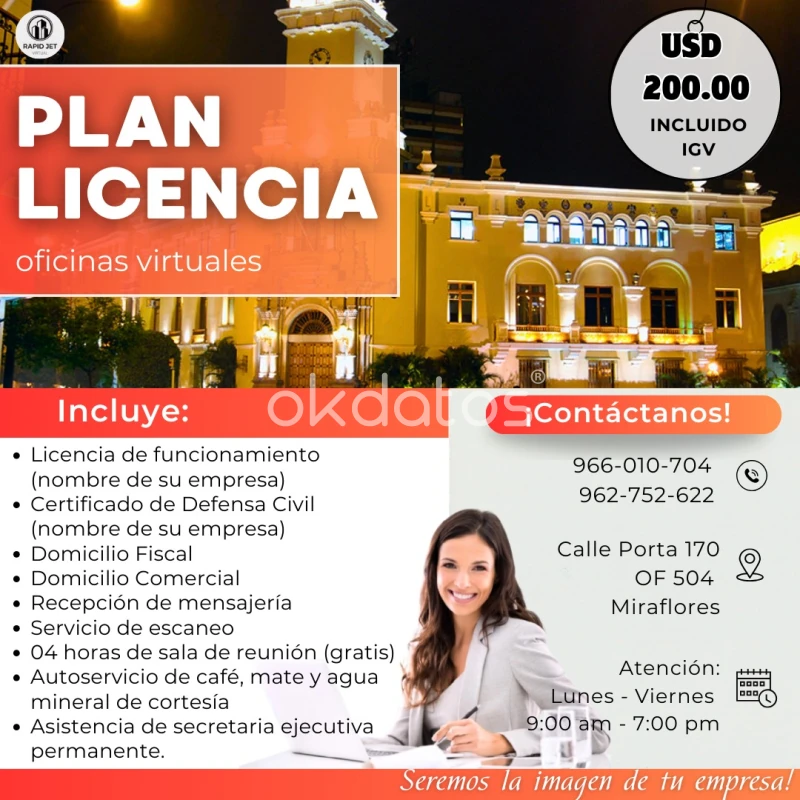 Con Rapid Jet, obtén todo lo que necesitas para operar con éxito: - Licencia de funcionamiento personalizada - Certificado de Defensa Civil a nombre de tu empresa - Domicilio Fiscal y Comercial en una ubicación privilegiada - Recepción de mensajería y servicio de escaneo - Salas de reuniones con 04 horas gratuitas - Atención profesional con asistencia ejecutiva - Café, mate y agua mineral de cortesía Costo: USD 200.00 (Incluye IGV) Ubicación: Calle Porta 170, OF 504-507-511, Miraflores Contáctanos: 962-752-622/ 966-010-704 Horario: Lunes a viernes, 9:00 am - 7:00 pm