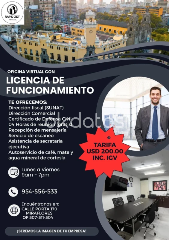 ¿Buscas una dirección comercial y fiscal sin complicaciones? Con Rapid Jet, obtén todo lo que necesitas para operar con éxito: ✅ Licencia de funcionamiento personalizada ✅ Certificado de Defensa Civil a nombre de tu empresa ✅ Domicilio Fiscal y Comercial en una ubicación privilegiada ✅ Recepción de mensajería y servicio de escaneo ✅ Salas de reuniones con 04 horas gratuitas ✅ Atención profesional con asistencia ejecutiva ✅ Café, mate y agua mineral de cortesía 🔹 Costo: USD 200.00 (Incluye IGV) 📍 Ubicación: Calle Porta 170, OF 504-507-511, Miraflores 📞 Contáctanos: 954-556-533 🕘 Horario: Lunes a viernes, 9:00 am - 7:00 pm 📢 ¡Seremos la imagen de tu empresa! 📢